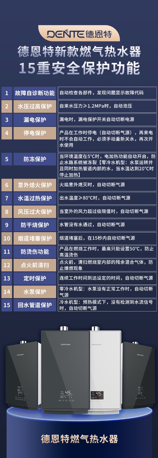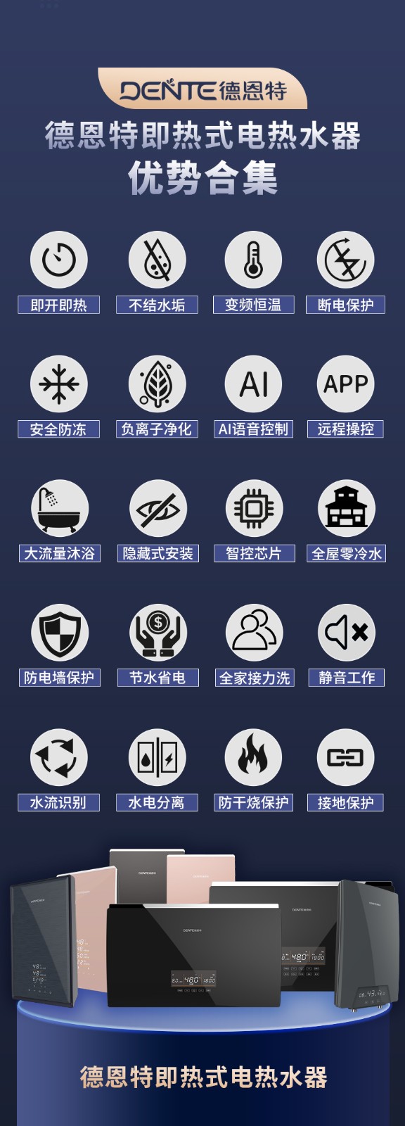德恩特品牌旗下涵蓋即熱式電熱水器,速熱式電熱水器,快熱式電熱水器品牌和凈水機等